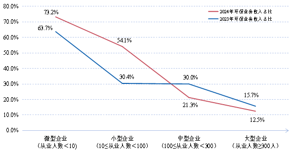 從企業(yè)規(guī)模看,大、中、小、微型企業(yè)年營業(yè)收入占調(diào)查企業(yè)總營收的比例分別為86.2%9.3%、4.5%0.1%,大型企業(yè)數(shù)量最少,但對環(huán)??偁I收的貢獻最大,小微企業(yè)數(shù)量較多,但產(chǎn)出貢獻。根據(jù)統(tǒng)計結(jié)果,統(tǒng)計范圍內(nèi)企業(yè)營業(yè)收入總額約563.96億元,其中環(huán)保業(yè)務(wù)營業(yè)收入約85.80億元,在總營業(yè)收入中占比15.2%。從企業(yè)類型看,2024大、中、小、微型企業(yè)環(huán)保業(yè)務(wù)收入占對應(yīng)類別年營收總額比重分別為12.5%、21.3%、54.1%74.7%,2023年相同指標分別為15.7%30.0%、30.4%63.7%。由此可見,企業(yè)環(huán)保業(yè)務(wù)營業(yè)收入占比情況與企業(yè)規(guī)模大致成反比,企業(yè)規(guī)模越大,其環(huán)保業(yè)務(wù)營收占比越低,顯示出大型企業(yè)呈多元化發(fā)展,小微企業(yè)呈專業(yè)化發(fā)展的現(xiàn)象,且這種差異化發(fā)展有加大的趨勢