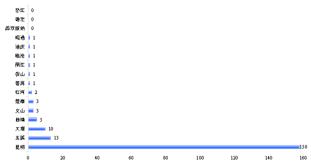 統(tǒng)計范圍內(nèi)的200家環(huán)保企業(yè)地域分布高度集中,滇中城市群聚集了調(diào)查范圍內(nèi)90.5%的企業(yè),共計181家,主要分布在昆明、玉溪、楚雄、曲靖四座城市,其中昆明環(huán)保企業(yè)158家,占統(tǒng)計企業(yè)總數(shù)的79.0%。