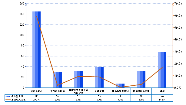 列入統(tǒng)計范圍的企業(yè)主要分布于水污染防治、大氣污染防治、固體廢物處理處置與資源化七個細分領(lǐng)域,其中,從事水污染防治的企業(yè)數(shù)量占比72.5%,貢獻了五成以上的環(huán)保業(yè)務(wù)收入