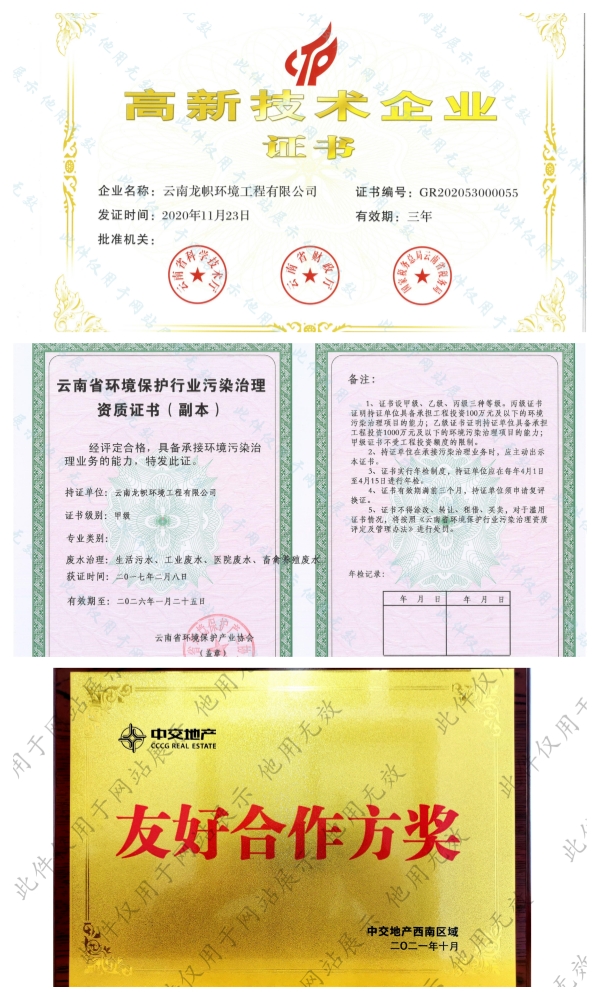 公司持有環(huán)保工程專業(yè)承包二級、市政公用工程總承包三級、建筑工程總承包三級、污染治理乙級、污染治理設(shè)施運行服務(wù)二級資質(zhì)證書。前后獲得“十二五”生態(tài)文明建設(shè)突出貢獻單位、云南省省級成長型中小企業(yè)、云南省知識產(chǎn)權(quán)優(yōu)勢企業(yè)、云南省科技型中小企業(yè)、云南省專精特新中小企業(yè)、招商蛇口最佳合作伙伴、中交置業(yè)友好合作方獎等榮譽。